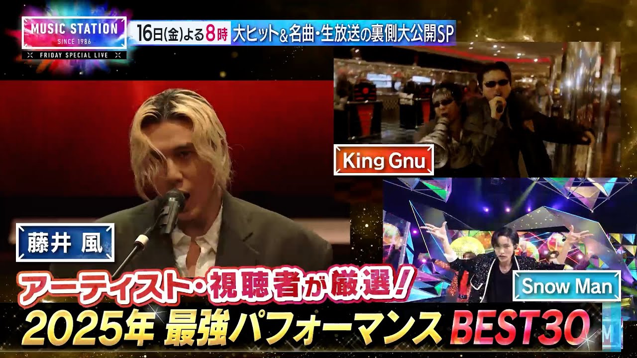 藤井 風、Mrs. GREEN APPLE、Vaundy、Snow Man、Official髭男dism、HANA、King Gnu、timelesz、back numberなど、2025年を彩ったアーティストのパフォーマンスが続々登場