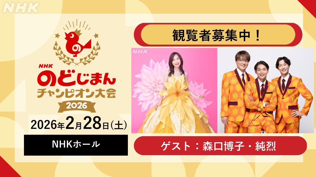 NHKでは、「NHKのど自慢チャンピオン大会2026」を実施します。この番組では、毎週日曜日に全国各地で実施している「NHKのど自慢」で選ばれたチャンピオンの中から、グランドチャンピオンと優秀賞を選出します。 観覧をご希望の方は、次の要領でお申し込みください。