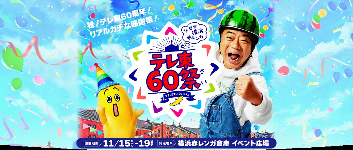 この節目を記念し、日頃テレ東を支えてくださる視聴者の皆様への感謝の気持ちを込めて11月15日(水)~19日(日) の期間、横浜赤レンガ倉庫イベント広場にて60周年記念イベント「テレ東60祭 なぜか横浜赤レンガ」(読み:てれとうろくじゅっさい なぜかよこはまあかれんが)を開催いたします。