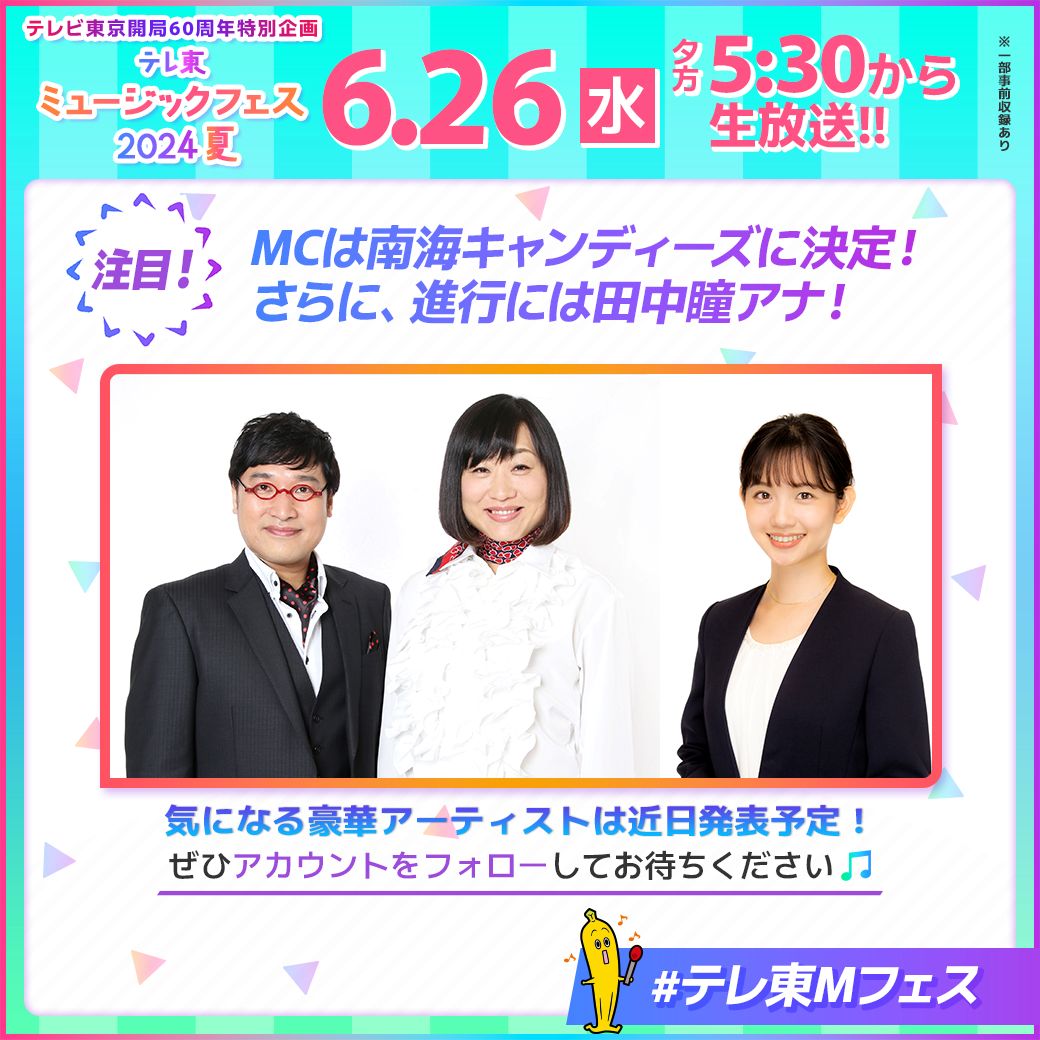 2015年の第2回放送開始以来、国分太一さんが総合司会を務める「テレ東音楽祭夏」については6月2日時点で未発表で、今回発表の「テレ東ミュージックフェス2024夏」と「テレ東音楽祭夏」の関連性についても触れられていない。テレビ東京は昨年、同局60周年記念として「テレ東60祭!ミュージックフェスティバル」を放送している。