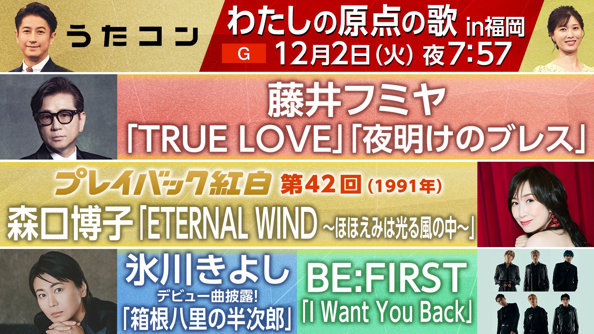 12月2日のうたコンは“わたしの原点の歌”をテーマに福岡からお届けする。まずは藤井フミヤが名曲「TRUE LOVE」を、そして氷川きよしがデビュー曲「箱根八里の半次郎」を披露。さらに、森高千里が「この街」を、前川 清が「長崎は今日も雨だった」を歌唱する。
